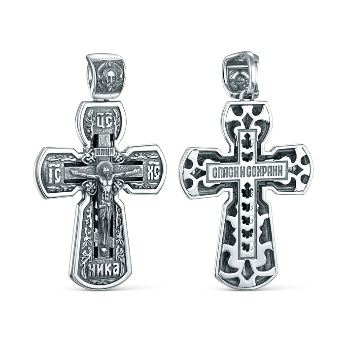 Крест из чернёного серебра - Рaспятие, Спаc Неpукотвоpный, Спаси и сохрани ПК-07