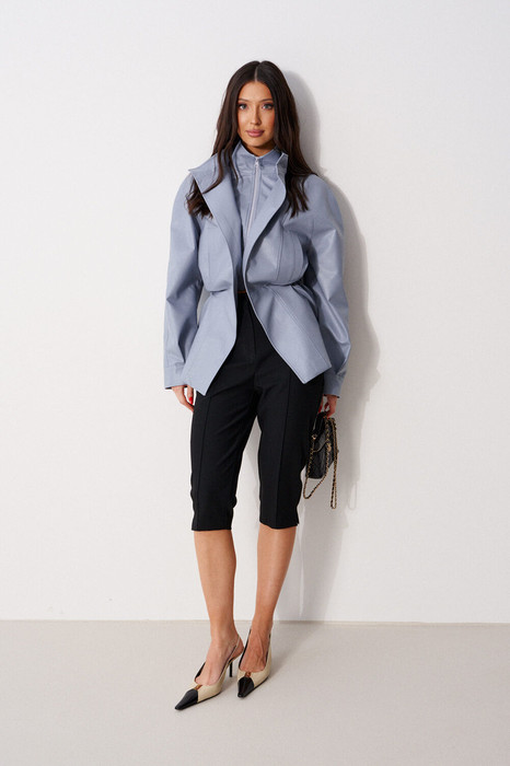 Куртка свободного кроя выполнена из эко-кожи голубого цвета. Характеристики: подкладка, воротник-стойка, рукав реглан с манжетом, внутренняя часть изделия - манишка с центральной застёжкой - молнией, основная часть изделия с прорезными карманами с листочкой, по линии талии - резинка, с кулиской, с фиксаторами. Длина рукава от горловины 79 см. Длина спинки 73 см.