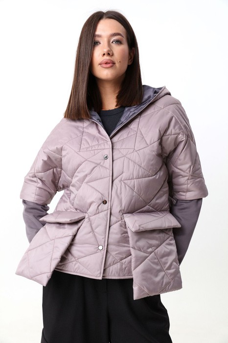 Укороченная куртка с капюшоном и застежкой на кнопки. Рукава куртки состоят из двух видов ткани. По переду  куртка дополнена накладными карманами с клапаном , выходящими за пределы длины куртки.