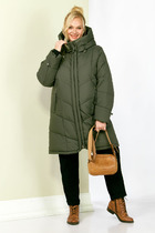 Куртка свободного кроя, длиной выше бедер, по спинке удлинена. Куртка на синтепоне с горизонтальной стежкой. По переду прорезные карманы с листочкой. Рукава одношовные, втачные, длиной 7/8. Горловина округлой формы, без воротника. По переду двубортная застежка на кнопки. Куртка на подкладке.