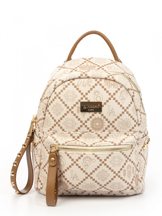 Рюкзак выполнена из экокожи канва. Детали: 1 короткая ручка 15см., 2 регулируемые лямки на плечо укрепленные стропой от 50см до 95см. Внутри изделия: 1 отделение на молнии, 1 карман на молнии, 1 евро карман, 1 карман открытый. Снаружи изделия: 1 карман на молнии спереди изделия, 1 карман на молнии сзади изделия и 2 кармана по бокам изделия. Брендированная подкладка из хлопка. Металлическая брендированная фурнитура золотистого цвета. В комплекте фирменный пыльник.