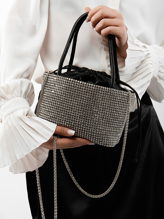 Сумка женская выполнена из текстиля, декорирована стразами, с элементами эко кожи. Детали: 2 короткие ручки по 37 см, 1 длинный ремешок на плечо из цепочки 120см. Внутри изделия: 1 отделение. Брендированная подкладка из хлопка. Металлическая фурнитура серебристого цвета. В комплекте фирменный пыльник.
