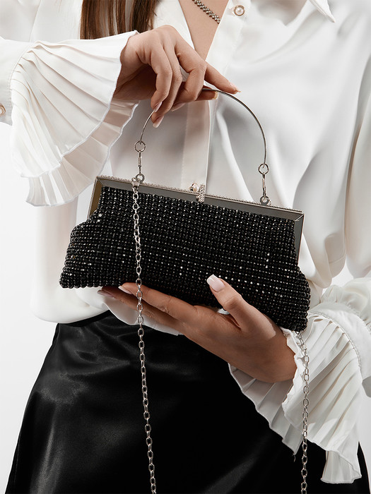 Сумка женская выполнена из текстиля, декорирована стразами. Детали: 1 съёмная короткая ручка 23 см, 1 длинный ремешок на плечо из цепочки 120см. Внутри изделия: 1 отделение на замке фермуар, 1 открытый карман. Брендированная подкладка из хлопка. Металлическая брендированная фурнитура серебристого цвета. В комплекте фирменный пыльник.