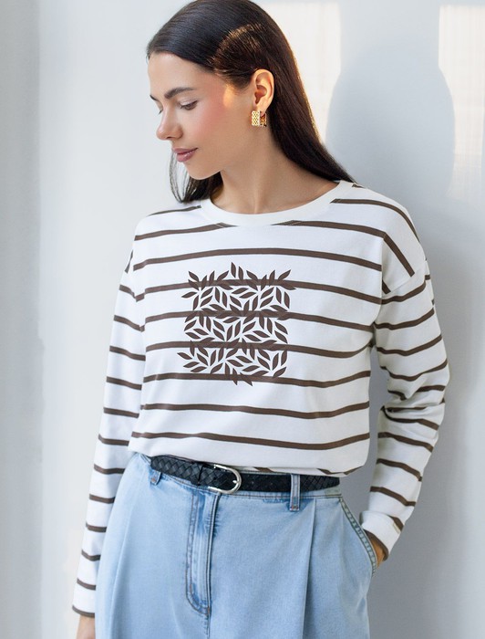 Состав: 92%Хлопок 8%ПУ Плотность: 170 Г/м2Свободный лонгслив белого цвета в кофейную полоску с длинным рукавом выполнен из премиального хлопка с добавлением эластана, плотностью 170 Г/м2, что обеспечивает комфорт и приятные тактильные ощущения. Полоска - придает изделию легкую текстурность, принт в виде листиков, который нанесен красками с устойчивым покрытием, добавляет стиля и индивидуальности, а круглый ворот создает универсальный образ, который подойдет для повседневного использования. Такой лонгслив идеально подходит для весеннего и летнего сезона благодаря легкой и дышащей ткани. Представленная широкая размерная линейка позволяет выбрать оптимальный вариант на любую фигуру, в том числе на плюс-сайз, обеспечивая свободу движений и удобство на каждый день. Этот комфортный лонгслив станет отличной базой в гардеробе, сочетаясь с различными стилями одежды и создавая простой, но эффектный образ.