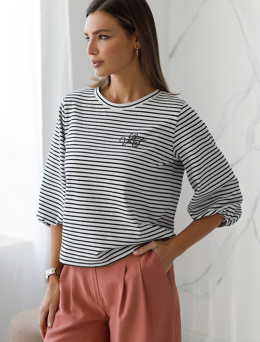 Состав: 92%Хлопок 8%ПУ Плотность: 170 Г/м2Свободный лонгслив в бело-черную тонкую полоску с рукавом средней длины выполнен из премиального хлопка с добавлением эластана, плотностью 170 Г/м2, что обеспечивает комфорт и приятные тактильные ощущения. Полоска - придает изделию легкую текстурность, аккуратная вышивка в виде букв логотипа бренда добавляет стиля и индивидуальности, а круглый ворот создает универсальный образ, который подойдет для повседневного использования. Объемные рукава буфы средней длины делают этот лонгслив женственным и изящным.Такой лонгслив идеально подходит для весеннего и летнего сезона благодаря легкой и дышащей ткани. Представленная широкая размерная линейка позволяет выбрать оптимальный вариант на любую фигуру, в том числе на плюс-сайз, обеспечивая свободу движений и удобство на каждый день. Этот комфортный тонкий джемпер станет отличной базой в гардеробе, сочетаясь с различными стилями одежды и создавая простой, но эффектный образ.