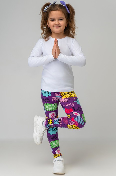 Добавьте ярких красок в обычный день! Лосины для девочки выполнены из очень мягкой ткани бамбук с высоким содержанием натурального хлопка. Детские легинсы фиолетового цвета украшены принтом надписи.