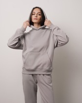 Домашний джемпер прямого силуэта из трикотажного полотна. Длинные рукава "реглан". Круглая горловина с уютным воротником и длинными шнурками-завязками.