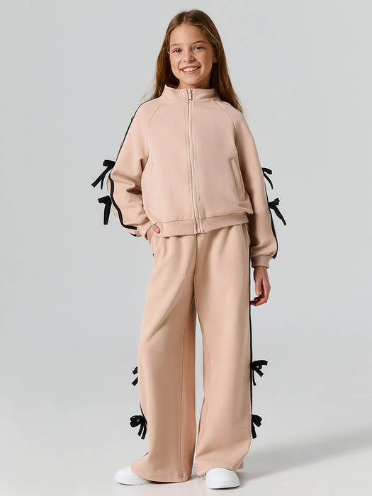 Брюки свободного силуэта с высокой посадкой. Пояс цельнокроенный с эластичной тесьмой внутри 40/50RV (по размерам). По поясу сделаны 2 отделочные строчки. По боковому шву брюк настрочены лампасы и бантики из кулирки. Карманы в боковых швах, подкладка кармана из трикотажного кулирного полотна. Низ брюк обработан швом вподгибку.
