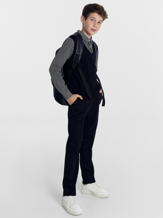 Брюки прямого силуэта из трикотажного полотна академик. Пояс с эластичной тесьмой внутри. Есть боковые карманы «хулиганы». Спереди брюки дополнены модными защипами. Штанины подогнуты. Для самых стильных мальчиков!