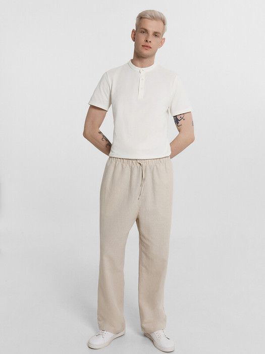 Мужские прямые брюки — это стильная и практичная модель, которая подойдет для повседневного образа. Средняя посадка обеспечивает комфорт и удобство, а эластичный пояс на кулиске позволяет настроить брюки под индивидуальные параметры, гарантируя оптимальную посадку. Карманы, расположенные в боковых швах, добавляют функциональности, позволяя хранить необходимые мелочи. Спереди модель дополнена гульфиком с застёжкой на петли и пуговицы, что подчеркивает классический стиль и практичность. Нижние срезы брюк обработаны швом вподгибку, что создает аккуратный и качественный внешний вид. Брюки выполнены из сочетания льна и хлопка — материалов с уникальными преимуществами. Лён обеспечивает отличную воздухопроницаемость и прохладу, что делает брюки идеальными для тёплой погоды. Хлопок добавляет мягкость и комфорт при носке, а также делает изделие долговечным и приятным на ощупь. Эта модель идеально подходит для создания непринужденных и стильных образов в весенне-летний период.