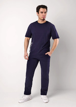Брюки прямые, посадка средняя. Пояс цельнокроёный с эластичной тесьмой внутри. С внутренней стороны пробиты петли и втянут шнур с застроченными концами (10PXC-1). На левой детали переда имитация гульфика. По переду карманы с отрезными бочками. Нижние срезы брюк обработаны швом вподгибку. На деталях спинки накладные карманы.