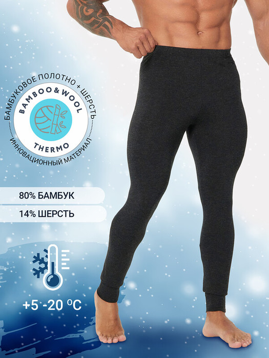 Комфортные мужские брюки из термо-материала. Силуэт облегающий по всей длине. Модель  без боковых швов, с мягкой эластичной тесьмой в поясе и плоскими швами. Специальное трикотажное полотно, состоящее из натурального бамбукового волокна, шерсти и эластана, дарит изделию особые гигиенические и термические свойства. Незаменимая деталь гардероба для прохладного времени года, охоты и рыбалки, активного отдыха и спорта. Рекомендуемый температурный режим: от +5 до -20 градусов Цельсия.