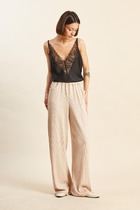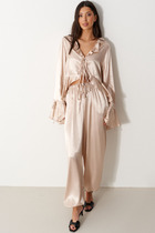 с эластичной тесьмой внутри. По поясу проложены отделочные строчки. В боковых швах карманы с отрезным бочком. По низу брюк подгибка с эластичной тесьмой внутри.