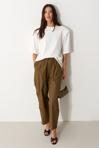 Брюки прямые свободные. Посадка средняя. Пояс цельнокроеный с эластичной тесьмой внутри. С внешней стороны пояса пробиты петли и втянут шнур. В боковых швах обработаны карманы. Подкладка карман из основного полотна. Нижние срезы обработаны швом вподгибку.