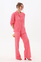Брюки прямые свободные. Пояс цельнокроеный с эластичной тесьмой внутри. С внешней стороны пояса пробиты петли и втянут шнур (8KXW-1 8мм.) с узлом на концах. В боковых швах обработаны карманы. Подкладка кармана из основного полотна. Низ брюк обработан швом впобгибку с эластичной тесьмой внутри.