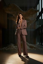 Брюки прямые, свободные. Посадка высокая.Пояс отрезной состоит из двух частей. Задняя часть с эластичной тесьмой внутри. В боковых швах обработаны карманы. На правой передней половинке проложена декоративная строчка - имитация гульфика. На передних и задних половинках заутюжены стрелки. Нижние срезы брюк обработаны швом вподгибку