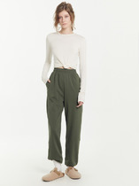 Брюки изготовлены из трикотажного полотна футер. Брюки прямые с высокой посадкой. Пояс отрезной из рибаны с эластичной тесьмой внутри. В передней части пояса с лицевой стороны пробиты петли и втянут шнур. Шов втачивания пояса распошит. Спереди обработаны карманы хулиганы. По низу брюк отрезные манжеты из рибаны.