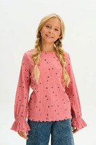 Джемпер свободного силуэта, с имитацией жилетки и рубашки. Жилет из селаника горловина V-образной формы. Рубашка из ткани горловина круглой формы, воротник с цельнокроенной стойкой. По переду центральная застежка на пуговицы. Плечо спущено, пройма углубленна. Рукава втачные, длинные из ткани. Низ рукава немного расширен и присборен, по низу рукава отрезная манжета из ткани. Низ изделия обработан швом в подгибку.