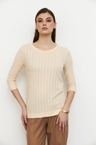 Укороченный женский джемпер прилегающего силуэта из трикотажного полотна. Вырез классический – круглый, не глубокий. Рукава длинные. Отличная база для ваших стильных образов!