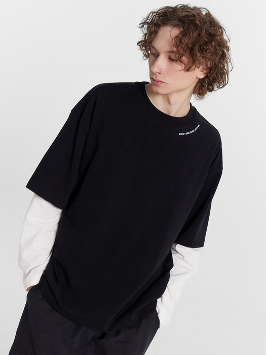 Футболка прямая свободная. Горловина округлой формы обработана обтачкой из рибаны. Шов втачивания обтачки по спинке закрыт бейкой из основного полотна. Линия плеча слегка спущена. Рукава втачные, корткие. Нижние срезы футболки и рукавов обработаны швом вподгибку на 2х шовной плоскошовной машине.