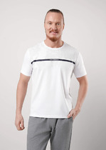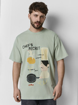 Футболка прямая, свободная. Горловина округлой формы обработана обтачкой из рибаны. Шов втачивания обтачки по спинке закрыт бейкой из основного полотна. Рукава втачные, корткие. Линия плеча спущена. Нижние срезы футболки и рукавов обработаны швом вподгибку.