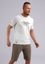 Футболка свободного силуэта. Перед и спинка цельнокроеные. Горловина круглой формы. Обтачка горловины из рибаны 1*1. По горловине проложена отделочная строчка. Горловина спинки закрыта тесьмой из основного полотна. Плечо спущено, пройма углублена. Рукав втачной, длина рукава чуть выше локтя.
