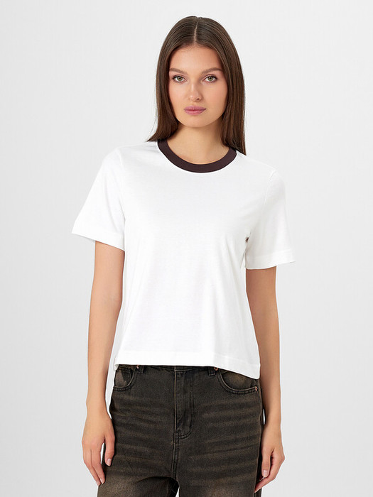 Футболка прямого силуэта из трикотажного полотна кулирка. Горловина круглой формы, широкая обтачка из рибаны.