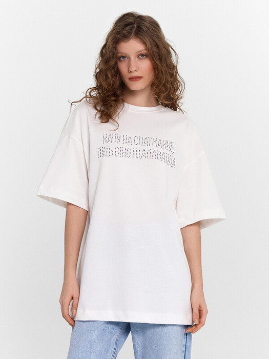 Эта женская футболка оверсайз со стразами станет ярким акцентом вашего гардероба. Выполненная из хлопковой кулирки, она сочетает в себе комфорт и стиль. Кулирка - это мягкий, прочный и воздухопроницаемый материал, отличающийся особой износостойкостью. Футболка имеет круглую горловину и спущенное плечо, а широкий рукав длиной чуть выше локтя добавляет модели стильный объем. Удлиненный силуэт делает эту модель идеальной для создания современных и удобных образов. Такой стильный и комфортный элемент одежды прекрасно подойдет для повседневной носки, добавляя блеска вашему образу. Рекомендуем!