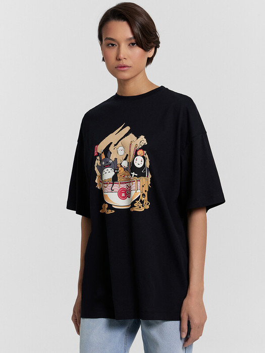Футболка силуэта оверсайз из трикотажного полотна кулирка. Горловина круглой формы, обтачка горловины из рибаны. Шов горловины спинки закрыт бейкой из основного полотна.