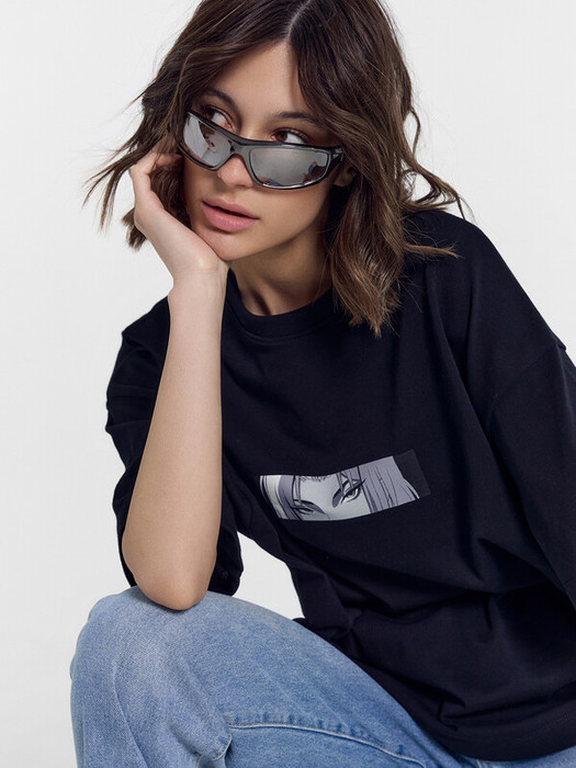 Футболка силуэта оверсайз из трикотажного полотна кулирка. Горловина круглой формы, обтачка горловины из рибаны. Шов горловины спинки закрыт бейкой из основного полотна.
