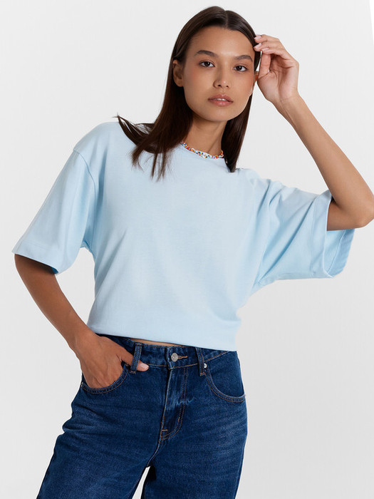 Нижние срезы футболки и рукавов обработаны швом вподгибку.