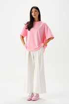 Футболка прямого силуэта, укороченная. Горловина круглой формы обработана бейкой в 3 сложения из основоного полотна. Рукава втачные, корткие. Нижние срезы футболки и рукавов обработаны швом вподгибку.