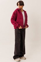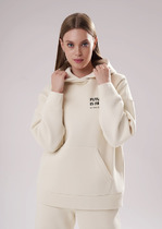 Худи изготовлен из трикотажного полотна футер 3х нитка с подчесом. Худи свободного силуэта. Горловина круглой формы с капюшоном. Капюшон со средним швом на подкладке из кулирки. С внешней стороны пробиты петли и втянут шнур (8КXW-1) с завязвнными концами. Рукава втачные, длинные. Плечо спущено, пройма углублена. По низу рукава отрезная манжета из рибаны. По плечу отрезная декоративная деталь. По низу худи отрезной пояс из рибаны. Шов втачивания обтачки и рукава, плечевые, шов притачивания пояса распошиты.