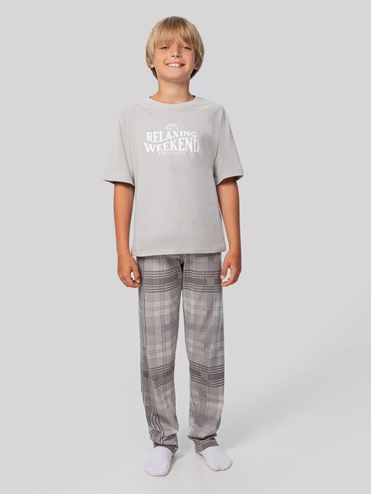 Этот домашний комплект для мальчиков — идеальное сочетание удобства, практичности и мягкости натуральных тканей. Он включает футболку и прямые брюки, выполненные из хлопка, который обеспечивает хорошую воздухопроницаемость и мягкость, особенно важные для активных детей. Футболка имеет классический круглый вырез с усиленной обтачкой из рибаны — она помогает сохранять форму даже после многократных стирок. Короткие рукава и низ футболки обработаны швом вподгибку, что придает изделию аккуратный и законченный вид. Брюки дополнены эластичным поясом, который мягко фиксируется на талии, не создавая дискомфорта. Прямой крой обеспечивает свободу движений, а застроченный низ делает их устойчивыми к износу. Комплект не только хорошо сидит, но и легко надевается — отличный выбор для дома, игр, сна или отдыха. Простота исполнения и качественные детали делают его универсальным вариантом на каждый день.