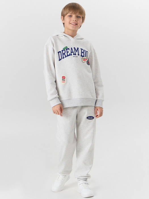 Худи свободного силуэта для мальчиков с капюшоном. Горловина округлой формы. Капюшон со средним швом, на подкладке из основного полотна. Плечо спущено, рукав втачной длинный. По низу рукава отрезная манжета из рибаны. Пояс отрезной из рибаны.Брюки для мальчиков. Без бокового шва. Карманы в вытачке. Пояс отрезной с внутренней эластичной тесьмой. Пояс прострочен двумя отделочными строчками. Внутри в пояс втянут шнур. Низ брюк обработан манжетами из рибаны.
