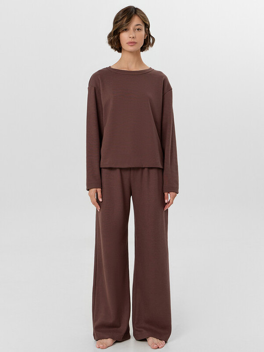 Комплект женский состоит из джемпера (502872) и брюк (532253). Джемпер домашний женский прямого силуэта. Горловина круглой формы, обтачка из основного полотна. Плечо слегка спущено. Рукав втачной, длинный. Нижний срез джемпера обработан швом вподгибку. Брюки с посадкой на талии, свободного силуэта. Пояс цельнокроеный с эластичной тесьмой внутри (внутр. 40мм 40RV). Нижний срез обработан швом в подгибку.