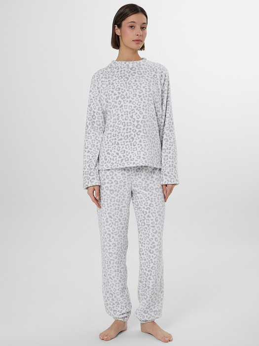 Свободный джемпер прямого кроя с круглой горловиной и длинными рукавами реглан обеспечивает полную свободу движений. Брюки со средней посадкой на мягком поясе с широкой резинкой удобно сидят по фигуре. Слегка зауженные к низу, они завершаются эластичной тесьмой для идеальной посадки, не стесняя движений во время сна или отдыха.