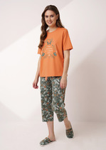 Эта женская пижама сочетает в себе комфорт и стиль для уютных ночей и домашних образов. Футболка приталенного кроя, выполненная из кулирки, идеально сидит по фигуре, обеспечивая максимальное удобство. Короткие рукава и круглый вырез добавляют лёгкости и свободы движений. Брюки свободного силуэта, изготовленные из рибаны, обладают эластичным поясом и боковыми карманами, что обеспечивает дополнительное удобство. Эта пижама станет отличным выбором для домашнего отдыха и сна, даря вам ощущение нежности и уюта.