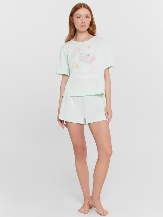 Комплект женский состоит из футболки и шорт. Футболка свободного силуэта. Горловина круглой формы, обтачка из основного полотна. Рукава втачные свободные, линия плеча слегка спущена. Низ рукавов и футболки в подгибку.