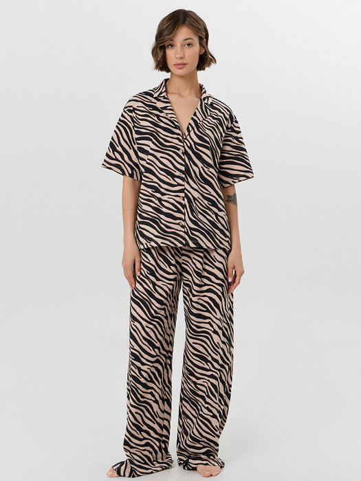 Женский домашний комплект, состоящий из рубашки и брюк, — это идеальное решение для комфортного отдыха и уютных домашних вечеров. Модель выполнена из натурального хлопка, который отличается мягкостью, воздухопроницаемостью и гипоаллергенными свойствами, обеспечивая приятные ощущения на коже и свободу движений. Рубашка свободного силуэта с отложным воротником выглядит аккуратно и стильно, а короткий рукав с немного спущенной линией плеча подчеркивает расслабленный характер изделия. Обработка рукава и низа швом в подгибку делает модель аккуратной и долговечной. Центральная застёжка на пуговицы с петлями добавляет удобства и классического акцента. Брюки свободного силуэта с посадкой на талии обеспечивают комфорт и не стесняют движений. Эластичный пояс мягко фиксируется, а декоративная бейка из основного полотна, протянутая через пробитые петли, добавляет стильный элемент. Низ брюк также обработан швом в подгибку, что сохраняет форму и аккуратность. Комплект идеально подходит для сна, отдыха или домашних дел, сочетая в себе практичность, уют и эстетичный внешний вид.