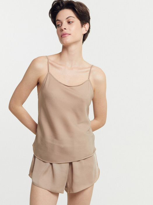 Комплект состоит из топа и шорт. Топ полуприлегающего  силуэта. Перед и спинка цельнокроенные. Горловина и проймы окантованы бейкой переходящей в бретель с регулировкой . Низ топа обработан на микрооверлоке.