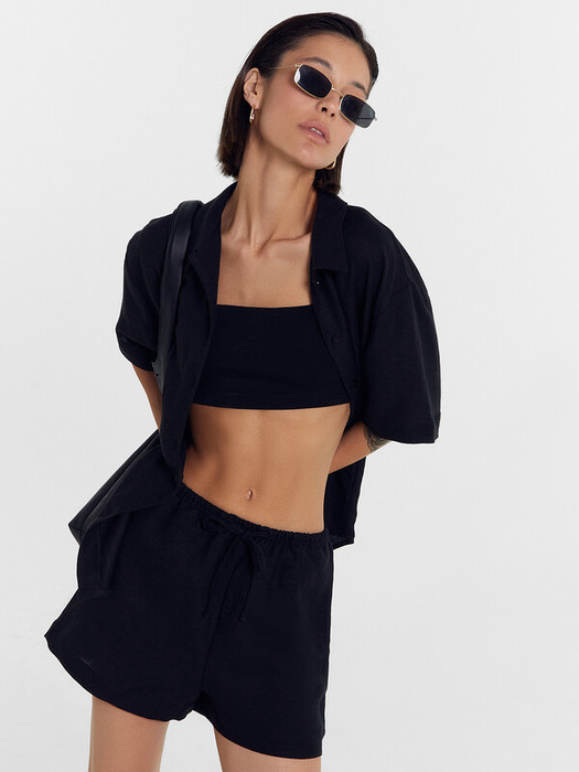 Комплект женский состоит из жакета и шорт. Жакет свободного силуэта, с воротником стойкой. Рукав втачной короткий, рукав обработан в подгибку. Жакет с центральной застежкой с петлями и пуговицами. Низ застрочен швом в подгибку. Шорты свободного силуэта, высокая посадка. Верх застрочен в подгибку с протянутым шнуром из основного полотна. В боковых швах карманы. Низ шорт обработан вподгибку.