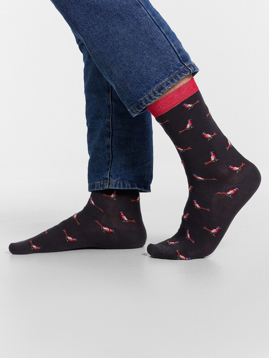 рис.2939 Мужской носок классический, высокий с рисунком в виде мелких попугаев и цветным бортиком.