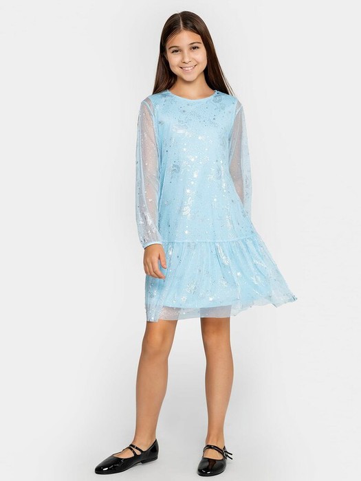 Нарядное платье А-образного силуэта для девочек. Изготовлено из полупрозрачной воздушной сетки с подкладкой из хлопковой кулирки. Вырез круглый, классический. На спинке застегивается на пуговицу. Рукава объемные, длинные. Отличный вариант для утренников и праздников!