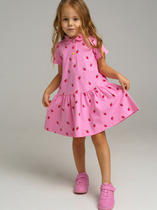 Платье свободного силуэта. Горловина круглой формы обработана обтачкой из рибаны. Шов притачивания рибаны распошит. Рукава длинные, втачные, внизу на сборке. Линия плеча спущена. По низу рукавов притачные манжеты из рибаны. Центральный шов по спинке с разрезом снизу. Низ изделия обработан на 2-х игольной плоскошовной машине швом в подгибку. Длина платья выше колена.