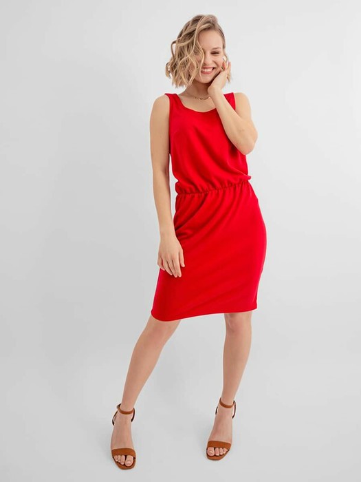 Платье из трикотажного полотна длиной выше колен, с прилеганием в области талии за счет