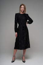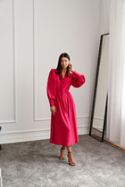 Женское полуприлегающее платье длиной выше колена из нежной и легкой вискозы. Модель отрезная по талии, внутри пояса проходит эластичная тесьма, образующая сборочки. Горловина круглая, рукава короткие и расширенные к низу. Нижний край платья украшен рюшей. На спинке застегивается на потайную молнию. Стильное платье для ваших летних образов!