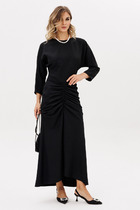 Прилегающее женское платье длиной ниже колена. Выполнено из трикотажной рибаны – в рубчик. Вырез круглый, с чуть удлиненным воротником. Рукава узкие, слегка удлиненные. От линии бедер платье расширяется и завершается асимметричным нижним краем. Красиво!