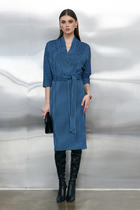 Платье из ткани полуприлегающего силуэта, отрезное по талии. Подрез под грудью со сборкой.
