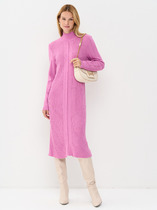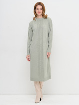 Платье полуприлегающего силуэта из ткани рошель. Горловина V-образной формы. Платье отрезное по талии, с эластичной тесьмой внутри. По эластичной тесьме проложены отделочные строчки. По детали переда средний шов. Детали спинки со средним швом. Рукав втачной, длинный. По окату слегка присборен. Длина рукава 3\4, по низу рукава настрочена эластичная тесьма которая делает сборку. Низ платья расширяется к низу. Длина платья ниже колена.